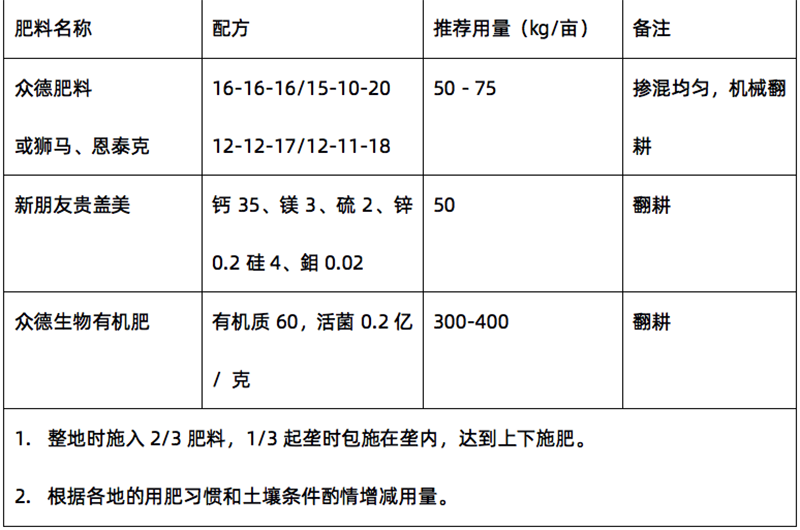 (2)推薦施肥套餐(根據(jù)目標(biāo)產(chǎn)量、地域、品種、地力等適當(dāng)調(diào)整)